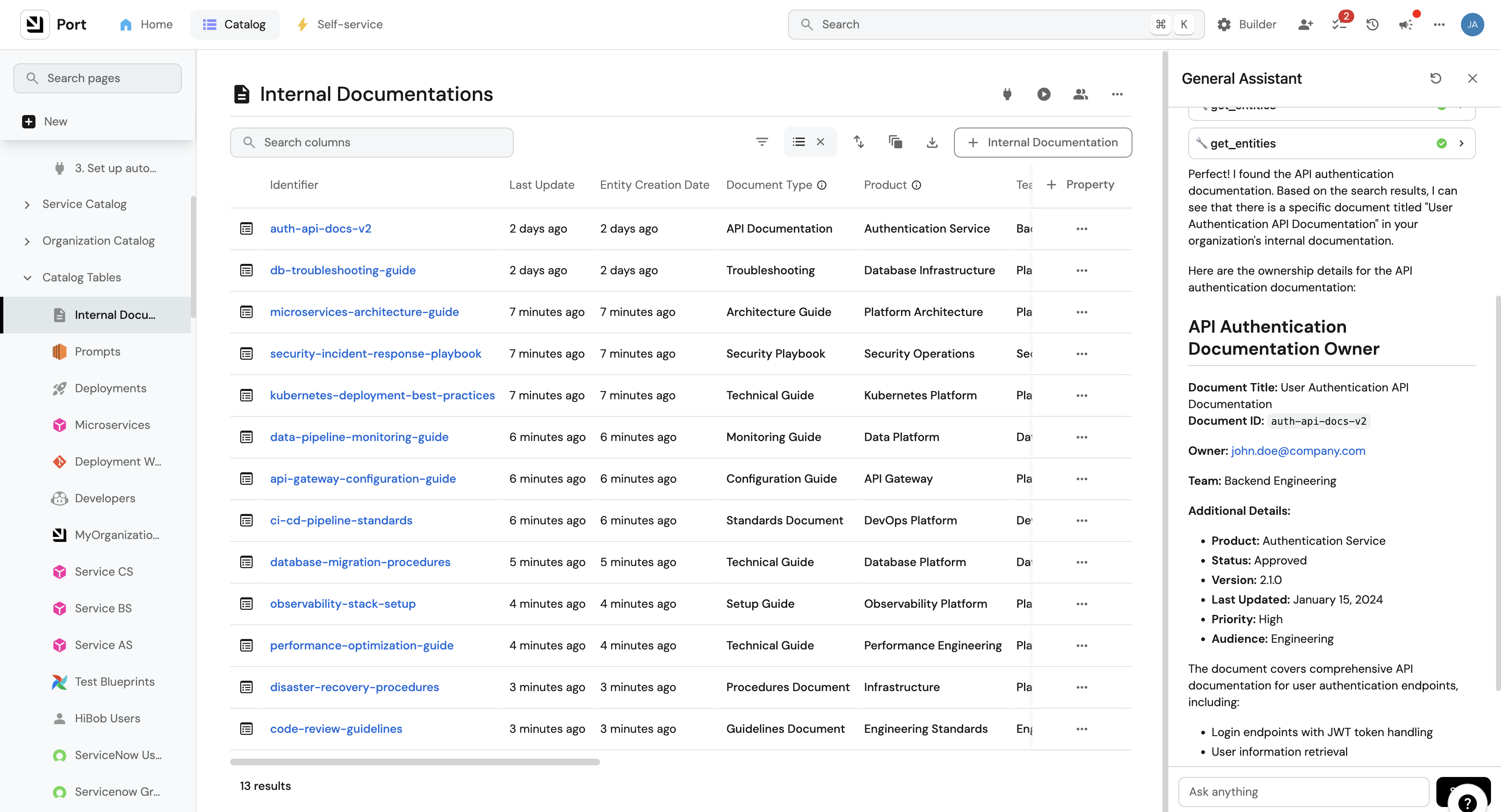 Sometimes, the AI might think you want to query Port technical documentation. In that case, you can instruct it to focus on your internal documentation by adding "in our catalog" or "from our internal documentation" to your prompt to clarify that you're asking about your cataloged entities rather than Port's general documentation.